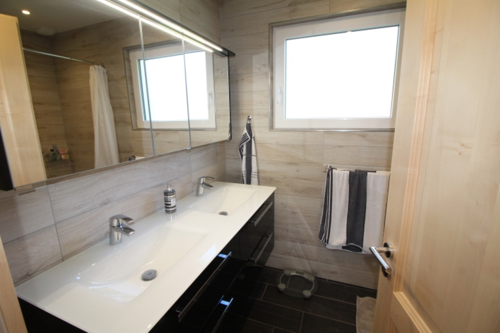 Le rez-de-chaussée dispose d'un hall d'entrée, de trois chambres, d'une cuisine équipée ouverte sur un spacieux salon-séjour agrémenté d'un poêle à bois, d'une salle d'eau et d'un WC séparé. Ce niveau bénéficie d'un balcon de plus de 35 m².